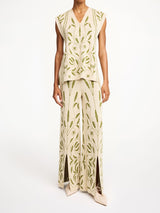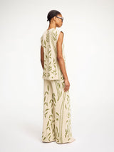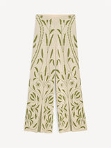 Den lekre og unike JORITH buksen har et unikt brodert print, inspirert av slyngplanter i en nydelig gresshoppe grønn farge. Buksen har en lang lengde med en stilig splitt i front på hvert ben. Style den med en tykk strikk, en enkel t-skjorte, vår oversized DERRIS skjorte eller matchende ISOLT vest.