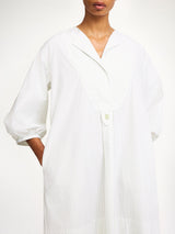 Den deilige FAYE tunika kjolen er laget i hvit organisk bomull, men grønne striper og den er enkel å style, både som kjole eller over matchende LUISA bukser. Den har lekre detaljer i front, en skjult knapp i front, samt flatterende tre kvart lange ermer.