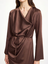 Den vakre og elegante CARRIE kjolen er laget for festlige anledninger. Den er laget med en utrolig lekker og drapert utringing, avtagbart og justerbart belte i livet, splitt nederst i siden, samt splitt nederst på de lange ermene.