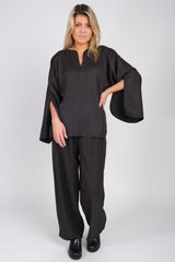 Den stilige PISCALI buksen kombinerer det litt bohemske, med det skreddersydde, da den er nett i livet og vid i bena. Buksen har belte hemper, legg i front lommer i siden og sitter godt i livet. Den er litt liten på størrelsen, så vi anbefaler å gå opp en størrelse.
