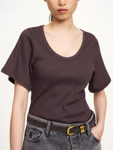 LUNAI t-skjorten er en videreutvikling av den klassiske t-skjorten med korte, trompetformede armer, nett kroppsform og en buet utringning. Den er laget i en deilig organisk bomulls miks, er ribbestrikket og blir en favoritt i skapet. Style den med alt fra vår MILIUM jeans, skinntights eller under en blazer.