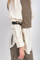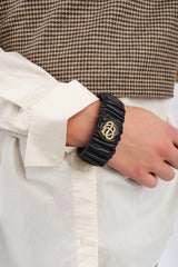 De stilige Evelo armbåndene kan entes brukes som armbånd, eller så er de prefekt å holde strikken, blazeren eller skorten din litt oppe på armen, så håndleddet kommer frem. De er laget i 100% skinn med en elastisk strikk på innsiden, så de kan passe alle, samt at det har vårt stilig SWIRL motiv på seg.
