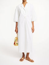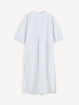 Den deilige FAYAMO kjolen er laget i hvit organisk bomull, men grønne striper og den er enkel å style. Den har lekre detaljer i front, en skjult knapp i front, samt flatterende tre kvart lange ermer og høye splitter i siden.