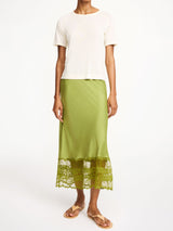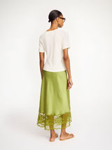 Det lekre BLAKE skjørtet er en oppdatert versjon av vårt super populære BOSHAN skjørt. Skjørtet har et fleksibelt materiale med et stilig og elegant snitt og en lekker blonderkant nederst. Skjørtet er langt og avslutter rett over anklene, noe som gir det et nett og elegant uttrykk. Skjørtet er noe asymmetrisk så det er lekent i måten det faller på og er fint å style med en enkel t-skjorte, en deilig strikk eller matchende CICIE bluse.