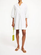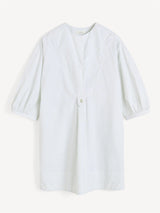 Den deilige FAYE tunika kjolen er laget i hvit organisk bomull, men grønne striper og den er enkel å style, både som kjole eller over matchende LUISA bukser. Den har lekre detaljer i front, en skjult knapp i front, samt flatterende tre kvart lange ermer.