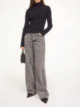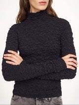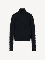 Den lekre AURA genseren vil bli en tidløs klassiker som du både kan pynte opp og ned. Den er laget med en stilig struktur, har høy hals, sitter etter kroppen og er både dresset og elegant på samme tid. Den er laget i en noe gjennomsiktig, stretchy kvalitet, så det er meningen at den skal sitte tett på kroppen og den har lange ermer og en nett høyhals.